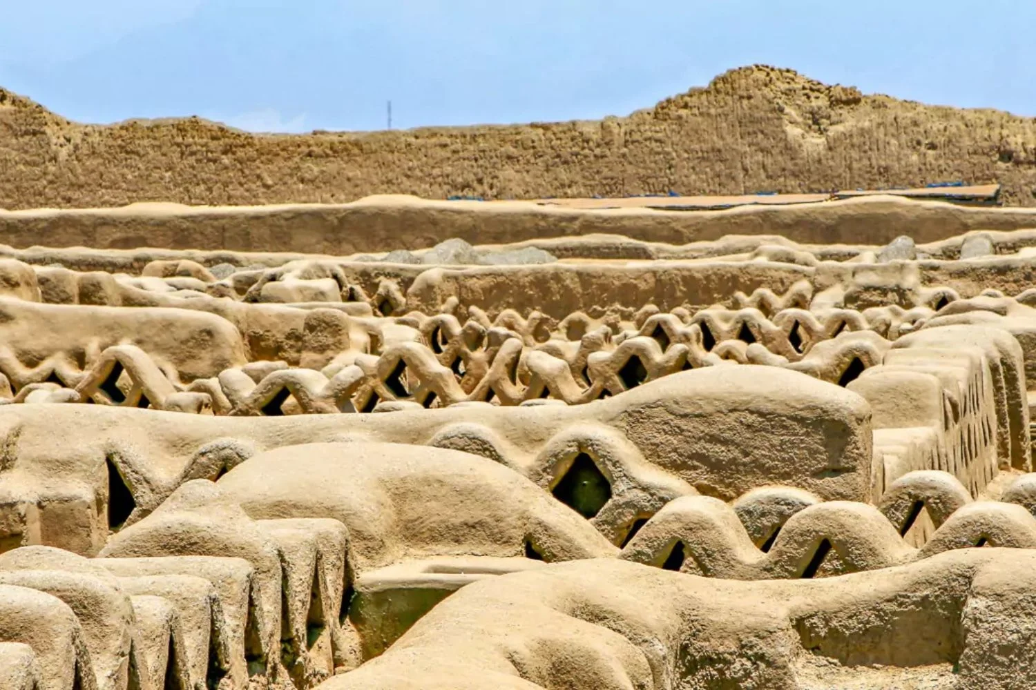 To the southeast of Chan Chan, two enormous adobe pyramids tower over the surrounding landscape—the Temple of the Sun and the Temple of the Moon. These monuments of the Moche culture were constructed between the first and eighth centuries.